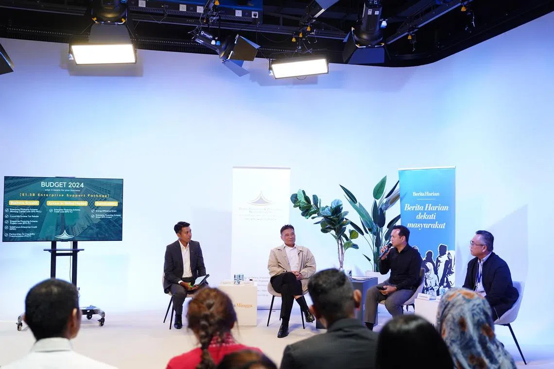 Moderator sesi perbincangan pasca-Belanjawan 2024 anjuran bersama Berita Harian dan Dewan Perniagaan dan Perusahaan Melayu Singapura (DPPMS), bendahari kehormat DPPMS, Encik Shamir Wahid (kiri), berinteraksi dengan ahli panel (dua dari kiri) Presiden DPPMS, Encik Abu Bakar Mohd Nor; Menteri Negara Kanan (Tenaga Manusia merangkap Pertahanan), Encik Zaqy Mohamad; dan Editor Berita Harian/Berita Minggu, Encik Nazry Mokhtar – tentang langkah sokongan yang diumumkan untuk perniagaan dan juga untuk pekerja pertingkat kemahiran. - Foto BH oleh NUR DIYANA TAHA