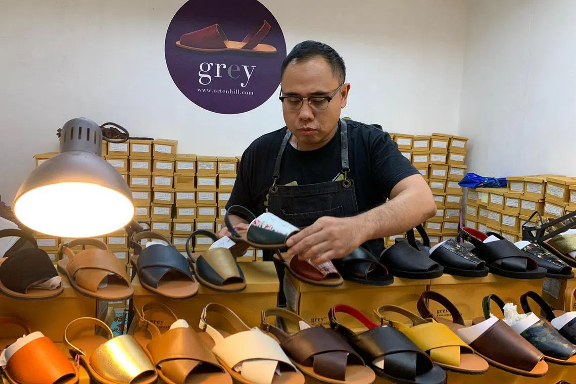 RINDU SUASANA NIAGA DI GEYLANG: Encik Trisno sedang menyusun sandal yang dijual di kedai baru yang disewa untuk jangka pendek di TKC. - Foto ihsan TRISNO ISHAK