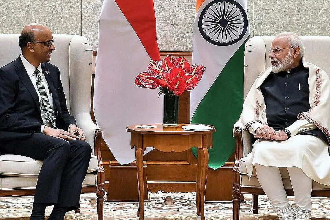 PERTEMUAN DUA PEMIMPIN: Semasa perbincangan antara Encik Tharman dan Encik Modi (kanan), Pejabat Perdana Menteri (PMO) India berkata mereka meluahkan kepuasan terhadap hubungan dua hala yang rapat antara kededua negara. - Foto PMO INDIA -