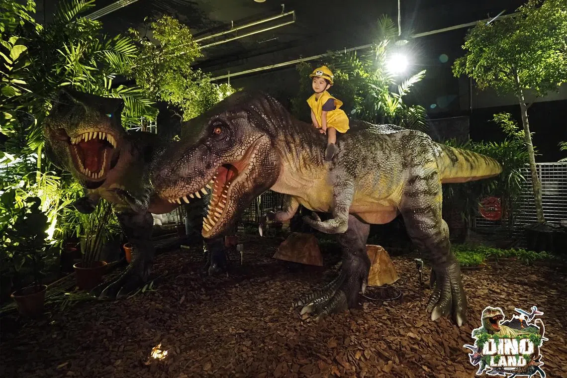 TEMUI RAKSASA REPTILIA: Di Dinoland Singapore yang terletak di Safra Yishun, kanak-kanak dapat bertemu dengan replika dinosaur seperti T-Rex dan Triceratops. Tarikan ini adalah satu imaginasi semula taman mini Jurassic seluas lebih 1,000 meter persegi dan menampilkan 20 replika dinosaur. - Foto DINOLAND