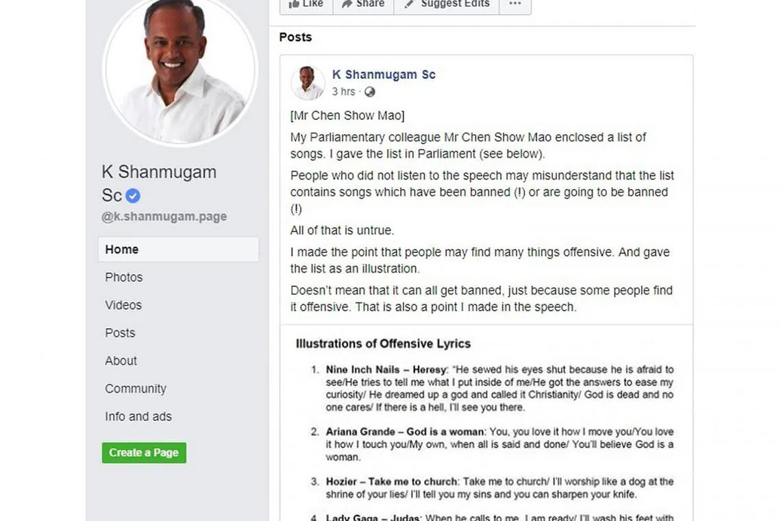 CONTOH LAGU YANG MUNGKIN DIANGGAP OFENSIF: Encik Shanmugam berkata senarai lagu yang diberikannya di Parlimen kelmarin adalah contoh lagu dengan lirik yang boleh dianggap ofensif oleh orang ramai, tetapi ia tidak bermakna semua lagu tersebut akan diharamkan. - Foto TANGKAP LAYAR FACEBOOK K. SHANMUGAM -
