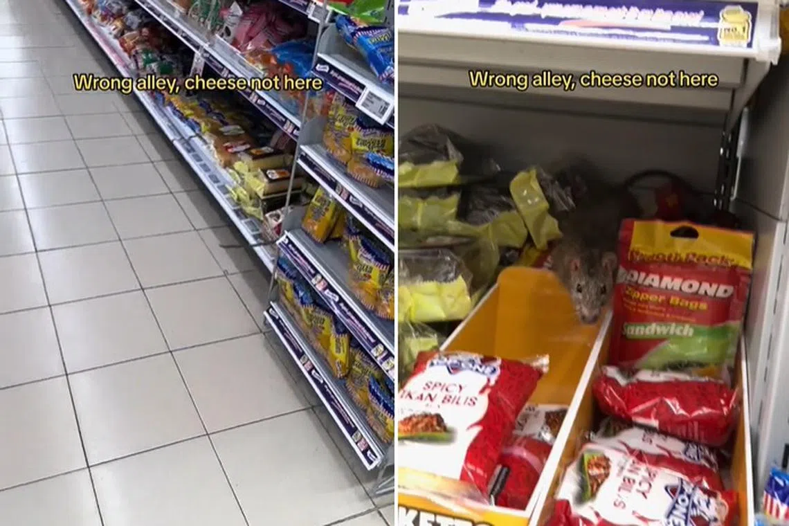 Kebetulan seekor tikus kelihatan merayap di rak-rak makanan cawangan di Pasir Ris West Plaza itu pada waktu malam.