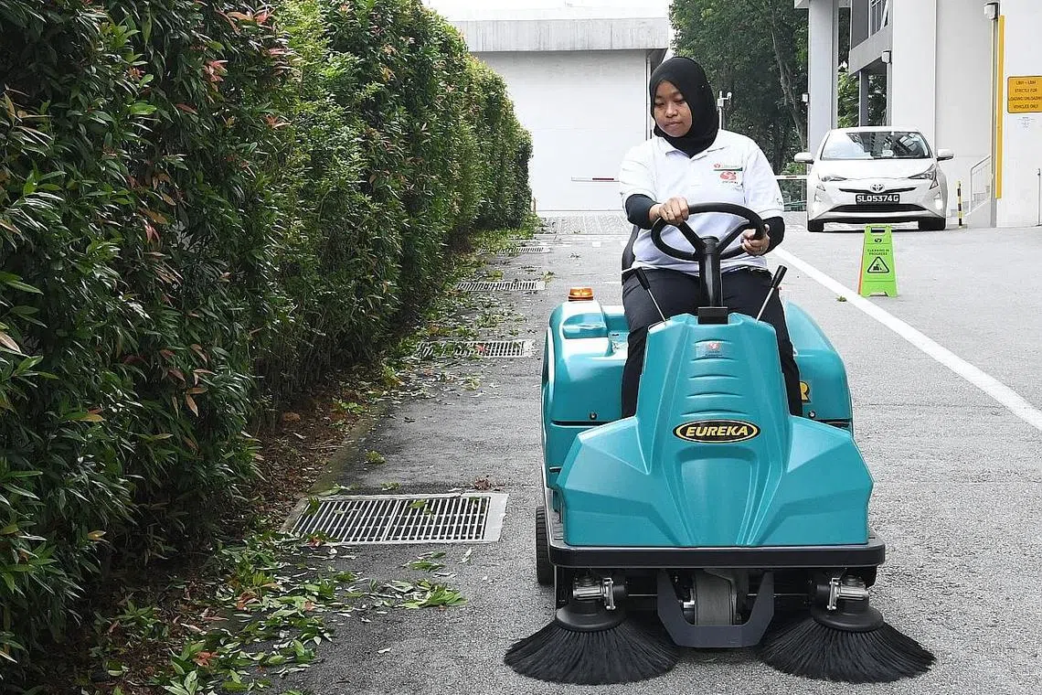 PERTINGKAT KEMAHIRAN: Selain menjalani latihan menggunakan mesin pembersihan baru yang memanfaatkan teknologi di tempat kerja, Cik Ainiah Mahmot mengambil inisiatif sendiri untuk menyertai kursus lain di luar pekerjaannya supaya dapat menimba pengetahuan lebih mendalam dengan harapan dapat terus mara dalam pekerjaannya. - Foto BH oleh KHALID BABA -