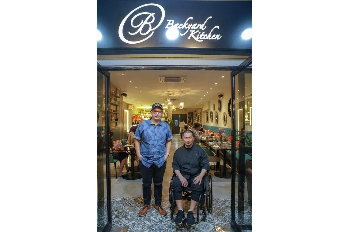 BANGKIT BERDIKARI: Cef Amri (berdiri) dan Cef Muhammad Haikal (duduk di kerusi roda) terus menceburkan diri dalam bidang kulinari yang mereka amat minati walaupun dilanda tragedi. Kini, Cef Amri menjadi konsultan pada Backyard Kitchen yang diketuai Cef Muhammad Haikal. - Foto BH oleh IQBAL FAIZAL -