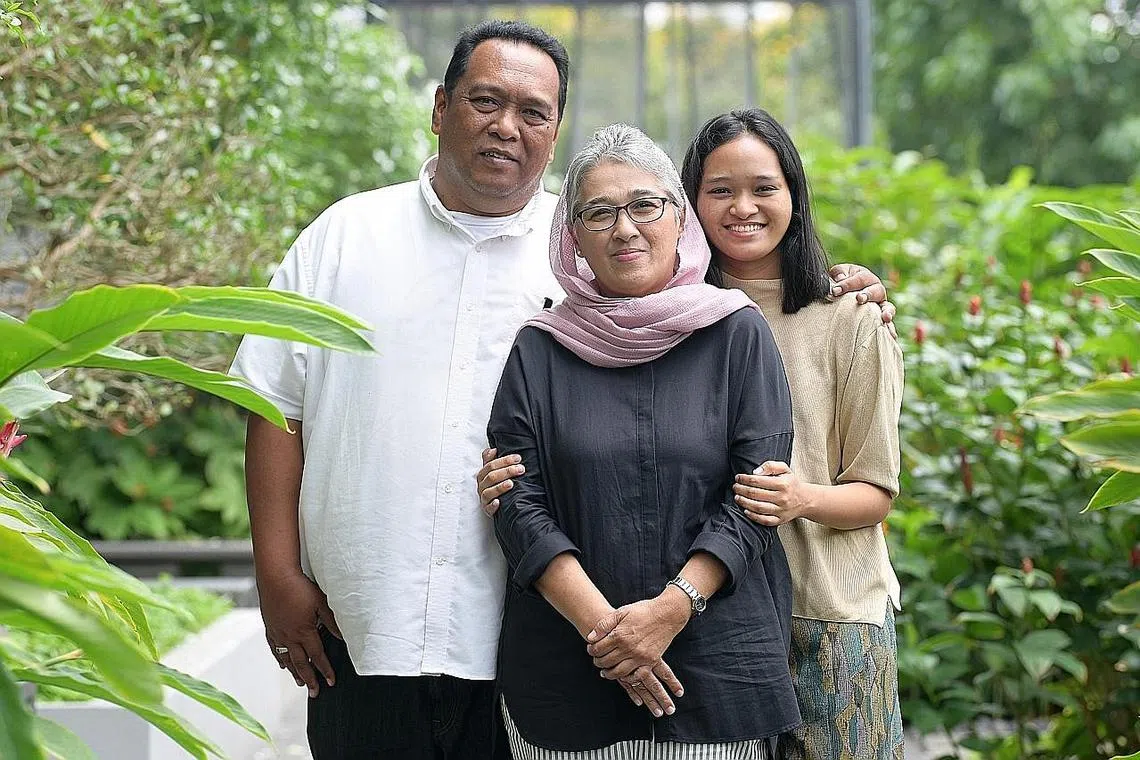 SOKONGAN KELUARGA: Cik Nasreen (tengah) merasakan dirinya masih bernasib baik kerana mendapat sokongan anggota keluarganya termasuk suaminya, Encik Mohd Riduan (kiri), dan anak keduanya, Cik Nur Atika (kanan), semasa menjalani rawatan bagi barah myeloma berbilang,. - Foto BH oleh NG SOR LUAN -