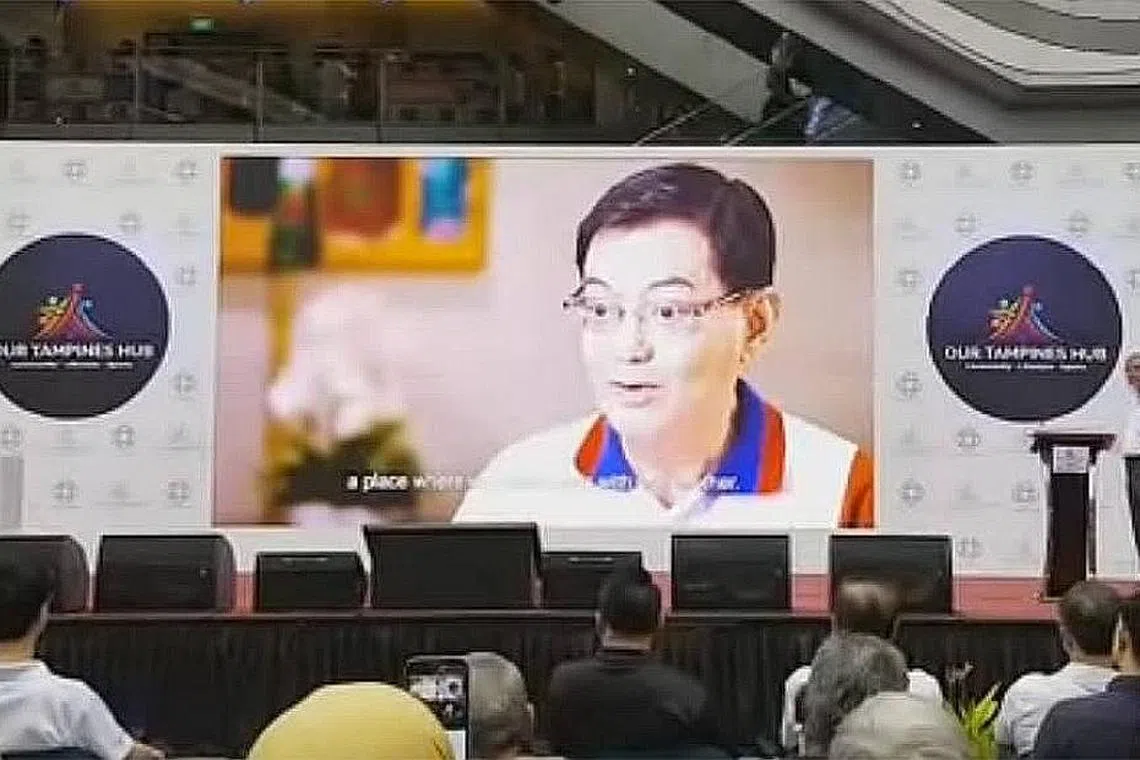 MENTERI Kewangan, Encik Heng Swee Keat, menyampaikan ucapan kepada penduduk menerusi video sebagai pengganti diri di pelancaran hab terbaru Tampines semalam.