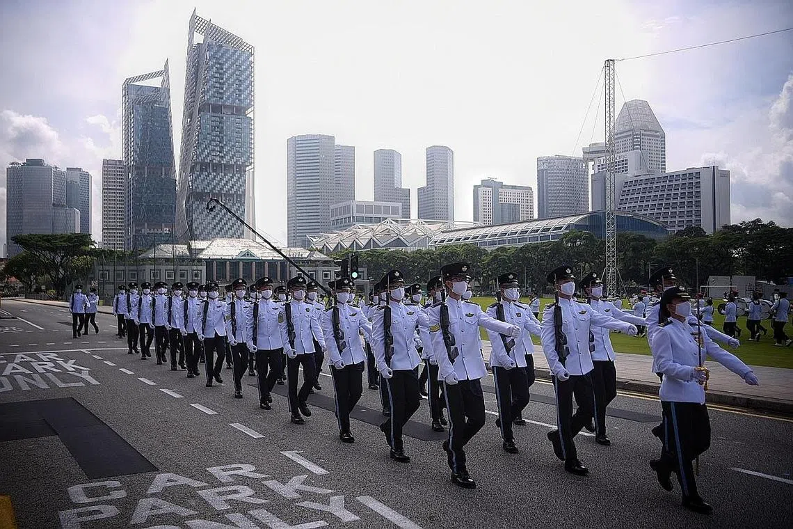BERSKALA KECIL: Perbarisan berskala kecil dengan setiap kontinjen mempunyai 36 peserta iaitu separuh berbanding tahun-tahun lalu dek langkah jarak selamat yang diadakan bersama dengan Tembak Hormat Presiden di Padang pada segmen pagi sambutan Hari Kebangsaan. - Foto-foto BH oleh MARK CHEONG -