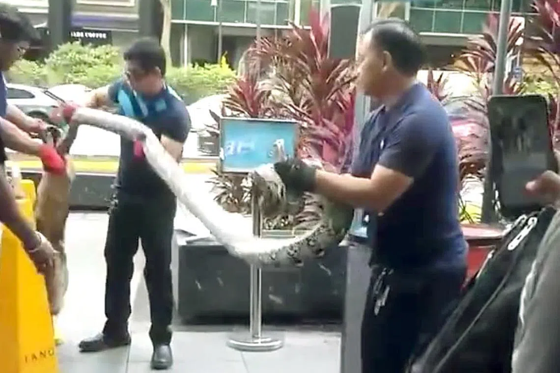 KENDALI DENGAN BETUL: Rakaman video menunjukkan pekerja kawal serangga cuba menangkap ular sawa di Orchard. -