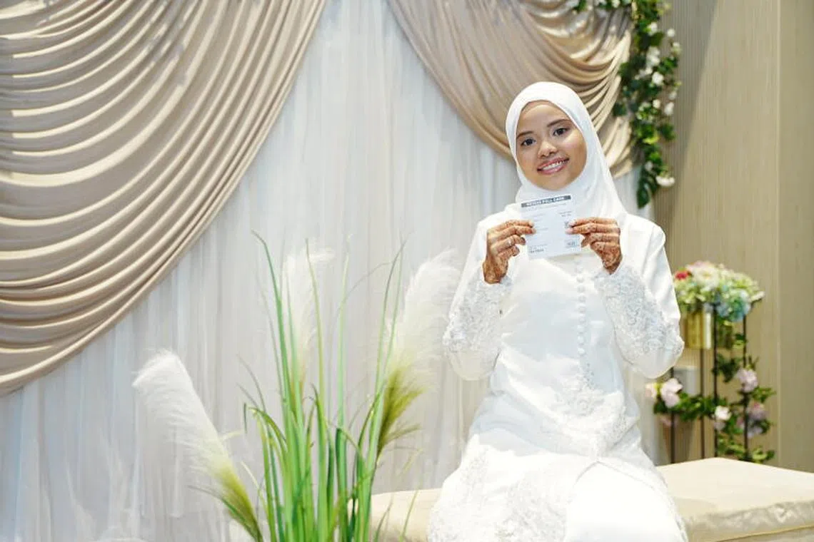 “Ibu saya yang suruh saya pakai baju nikah saya, supaya semua orang tahu saya akan kahwin,” kata Cik Fatin sambil ketawa.