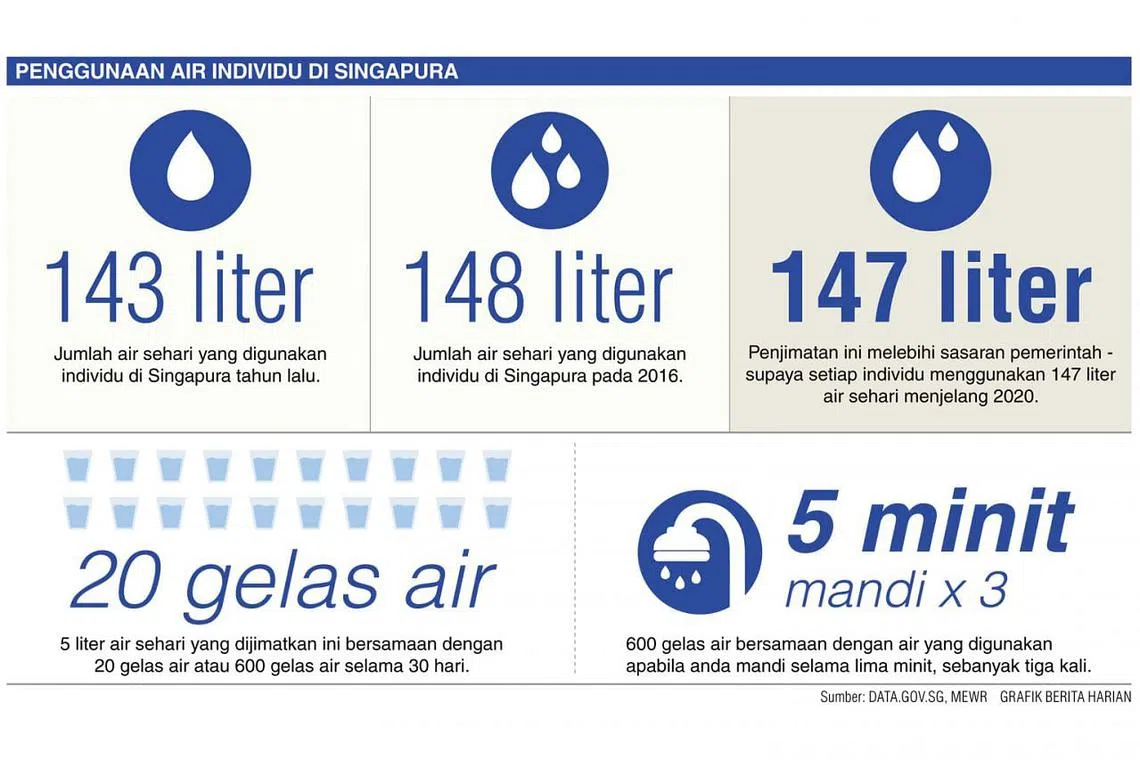 Setiap orang di Singapura menggunakan 143 liter air tahun lalu - penjimatan 13.7 liter air - berbanding 2007, apabila setiap orang menggunakan 156.7 liter air.
