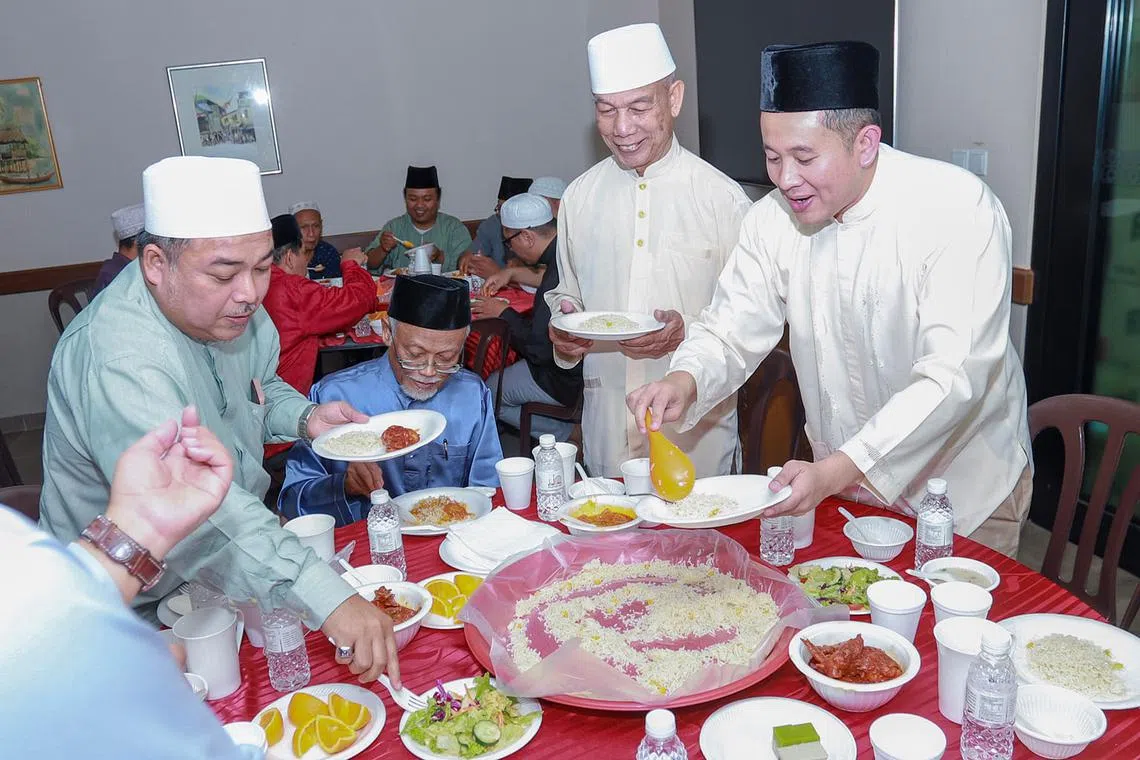 KENALI SATU SAMA LAIN: Encik Amrin Amin (kanan) menjamu selera bersama asatizah, termasuk Ustaz Pasuni Maulan (dua dari kiri) dan pengerusi Masjid Yusof Ishak, Encik Mohammad Ayub Johari (tiga dari kiri), dalam satu majlis iftar yang diadakan baru-baru ini. - Foto BH oleh IQBAL FAIZAL -