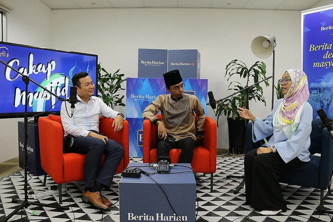 BINCANG TOPIK SOLAT?: Dua asatizah daripada Rangkaian Belia Asatizah (AYN), Ustaz Muhammad Fadhlullah Daud (kiri) dan Ustaz Muhammad Zulkarnain Azman (tengah), membincangkan faktor yang boleh menjejas solat yang didirikan baik secara bersendirian mahupun berjemaah. Bersama mereka ialah hos podcast 'Cakap Masjid' BH/BM, Cik Shahida Sarhid. - Foto fail -