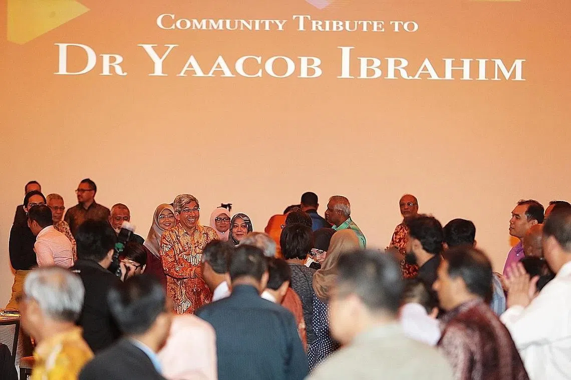 DIBERI PENGHARGAAN: Dr Yaacob (berbaju batik berwarna jingga) kelmarin dipuji kerana memastikan masyarakat Melayu/Islam Singapura mampu menghadapi arus kemajuan, terutama sekali melalui pendidikan. Antaranya termasuk memulakan Dana Amanah Pendidikan (ETF) dan menyatukan madrasah-madrasah di bawah Sistem Madrasah Bersepadu (JMS). - Foto BH oleh KELVIN CHNG -