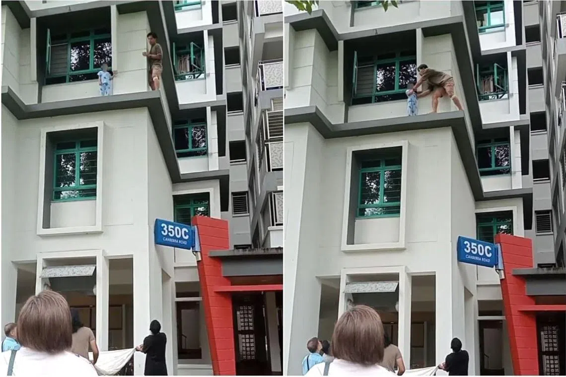 Beberapa orang awam yang prihatin dilihat memegang selimut terbuka di tingkat bawah untuk menyambut budak itu jika dia terjatuh.