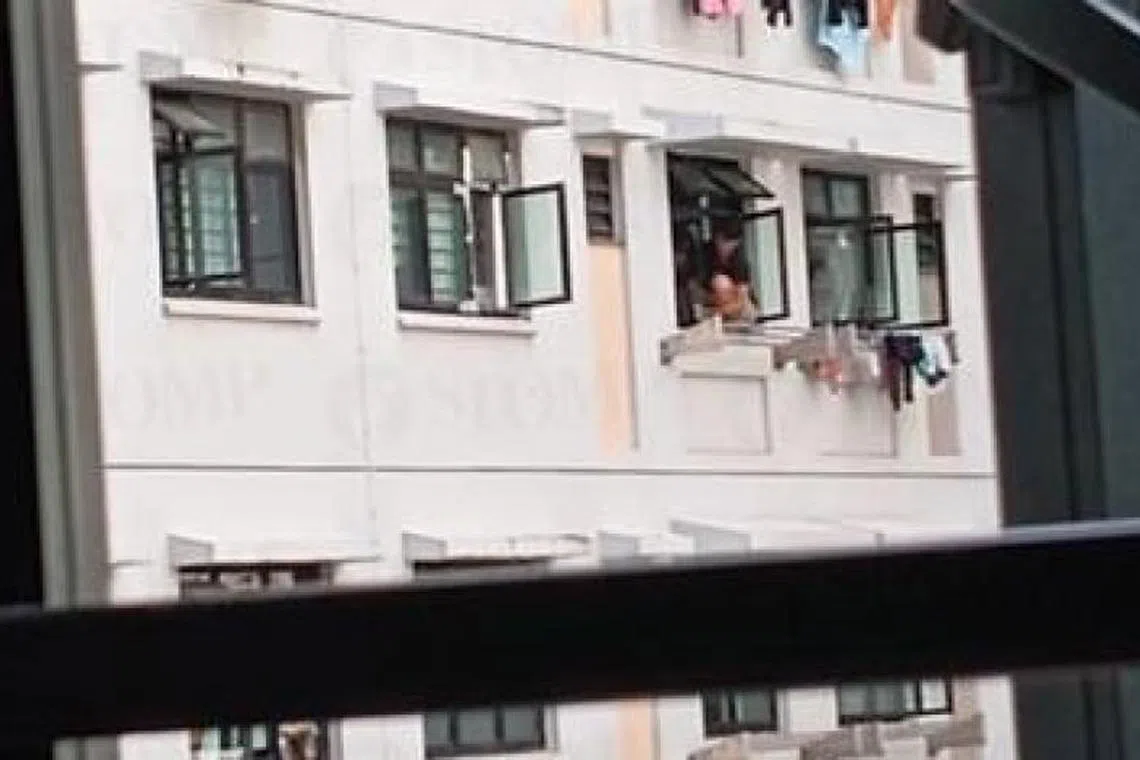 Seorang saksi H, yang ditemuramah The New Paper telah melahirkan kebimbangan selepas melihat wanita itu menyangkung di belebas tingkap sebuah unit tingkat enam pada sebelah petang dan berkongsi gambar aksi merbahaya itu.