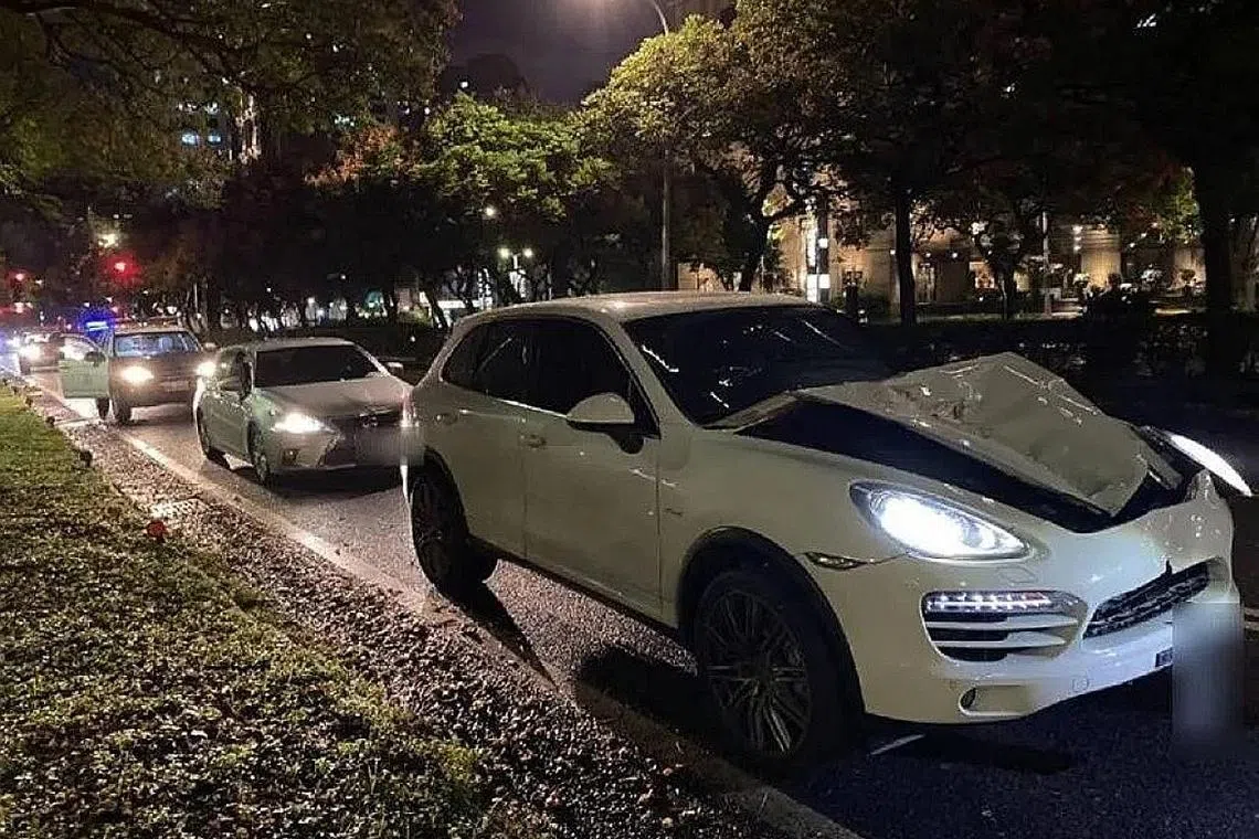 Mangsa sedang menyeberang jalan yang bukan untuk pejalan kaki apabila dilanggar oleh sebuah SUV Porsche putih di sepanjang Jalan Selatan Dunhua di Daerah Da'an Taipei pada kira-kira 9 malam.