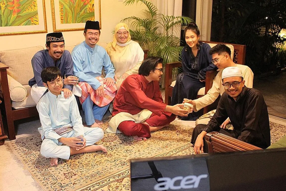 CUBA MULA TRADISI BARU: Encik Zainal Sapari sekeluarga, termasuk isteri, Cik Sazurah Mahmood (bertudung), dan anak-anaknya - Sarah, Ismail (baju biru gelap), Isa (baju kuning air), Ahmad Fitri (baju merah manggis), Azman (baju biru air) dan Abdullah (jubah hitam) - akan berpuasa enam bersama semasa Hari Raya ini dan melakukan panggilan Zoom bersama keluarga besar mereka untuk menyemarakkan suasana pagi Hari Raya di rumah. - Foto ihsan ZAINAL SAPARI -