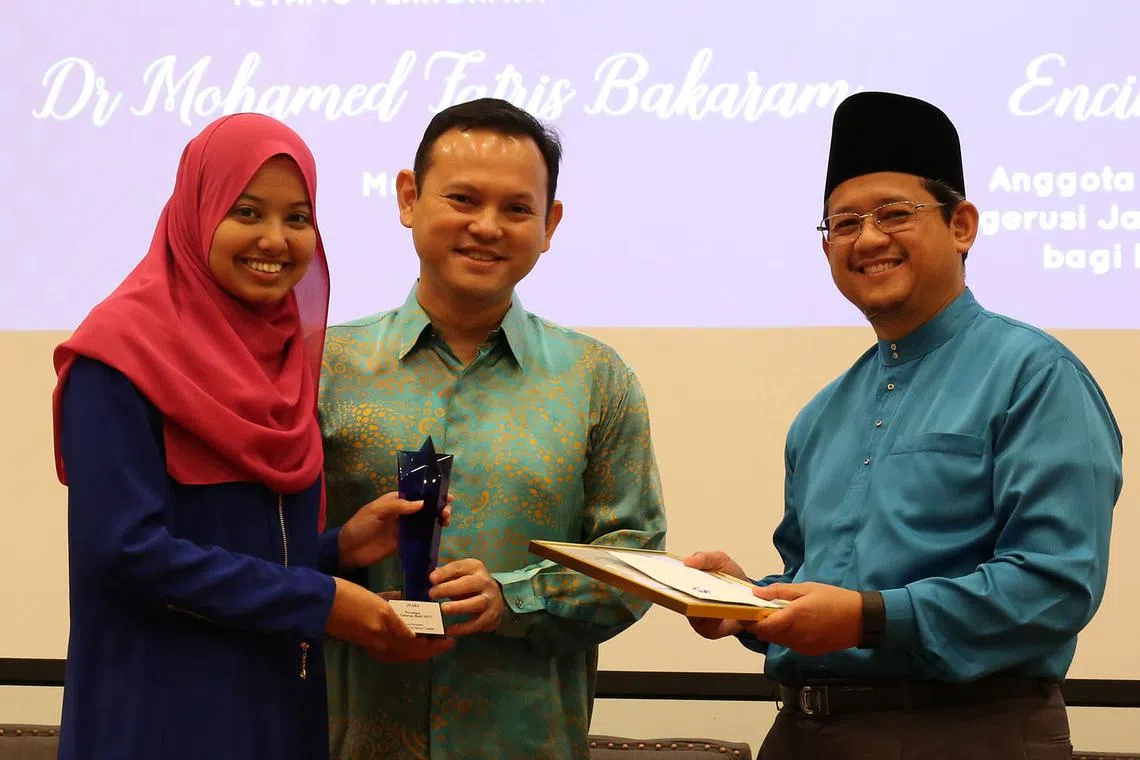 IKRAR WASATIYAH: Ikrar Wasatiyah yang bermaksud kesederhanaan hasil karya Cik Afifah Sheik Abdul Salam (kiri) berjaya menambat hati pengadil sekali gus menjadikannya juara bagi Peraduan Esei Cabaran Mufti tahun ini. Hadiah wang tunai $2,000 dan trofi disampaikan kepada Cik Afifah oleh Encik Zaqy Mohamad (tengah) dan Mufti Dr Mohamed Fatris Bakaram (kanan). - Foto PUTRI MARDHIYAH YAZID -