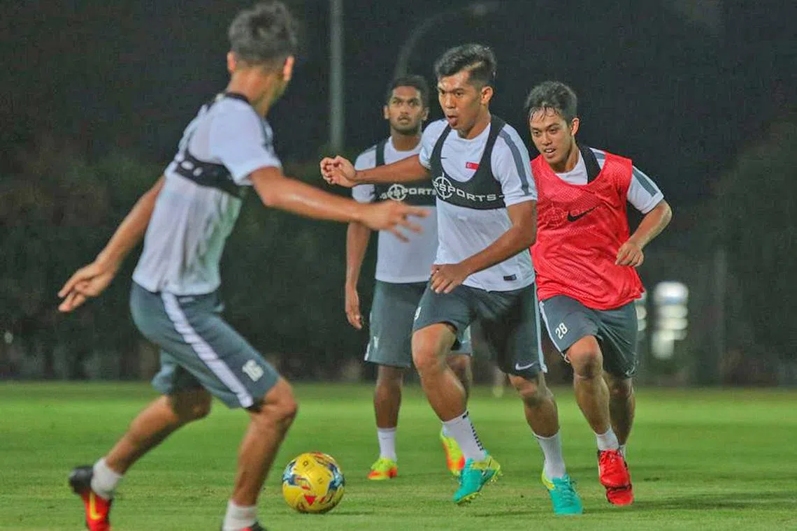 SENTUHAN BERBISA: Penyerang utama Singa, Khairul Amri Kamal (hadapan kanan), gigih beraksi di padang latihan pasukan nasional yang akan membuka kempen Piala Suzuki dengan menentang Filipina pada Sabtu ini. - Foto FAS -