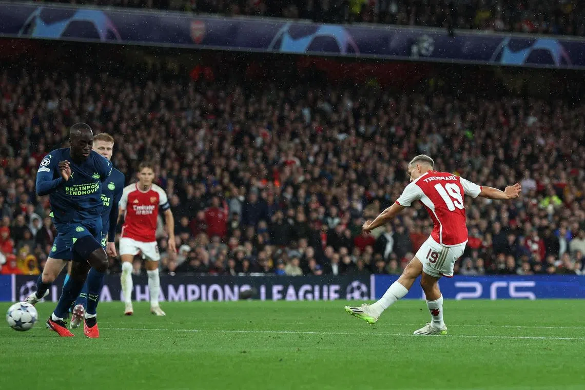 Bukayo Saka membuka tirai jaringan selepas lapan minit, apabila beliau menendang masuk bola yang ditepis penjaga gawang PSV, Walter Benitez, selepas dirembat Martin Odegaard.