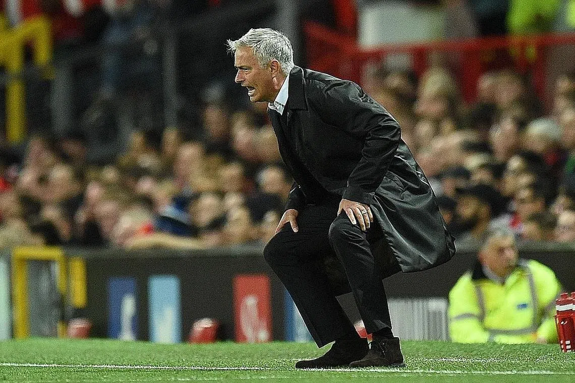 KEKALAHAN GANJIL?: Pengurus pasukan kelab bola sepak Manchester United, Jose Mourinho, sampai mahu menyangkung semasa mengarahkan pemainnya semasa perlawanan menentang Tottenham Hotspur di Old Trafford di Manchester, barat laut England kelmarin. - Foto AFP -