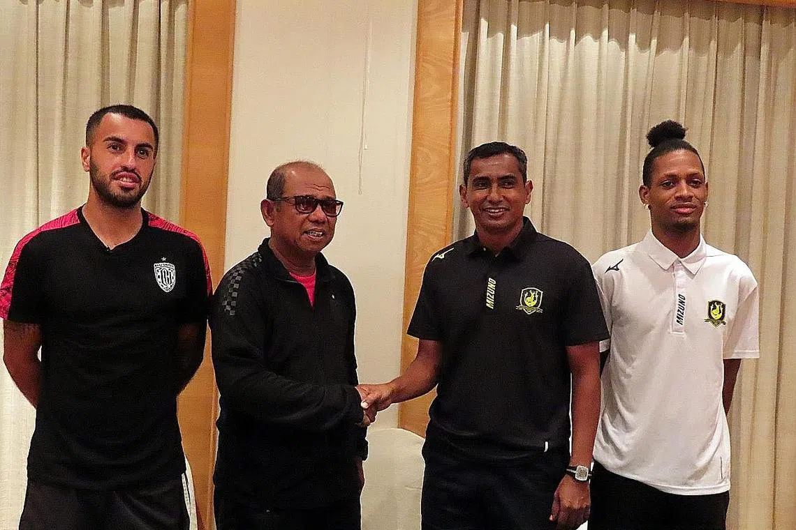 BUKA TIRAI: Kadir (tiga dari kiri) bersalaman dengan ketua jurulatih Bali United, Emral Abus (dua dari kiri) bersama pemain masing-masing, Brwa Nouri (kiri) dari Bali United dan Jordan Webb dari Tampines, di sidang akhbar praperlawanan pusingan awal kelayakan Liga Juara-Juara Gabungan Bola Sepak Asia (AFC) semalam. - Foto BH oleh ZULAIQAH ABDUL RAHIM -