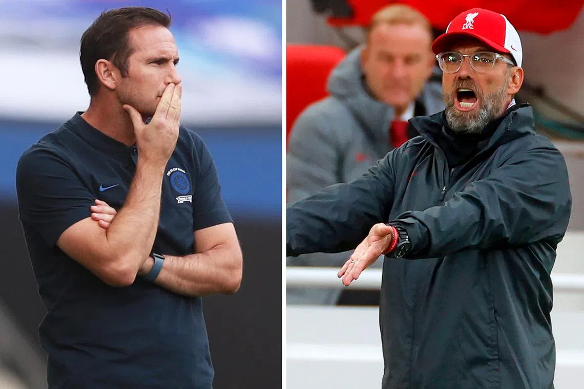 Frank Lampard, pengurus Chelsea (kiri) dan Jurgen Klopp, pengurus Liverpool (kanan). - Foto-foto REUTERS, AFP -