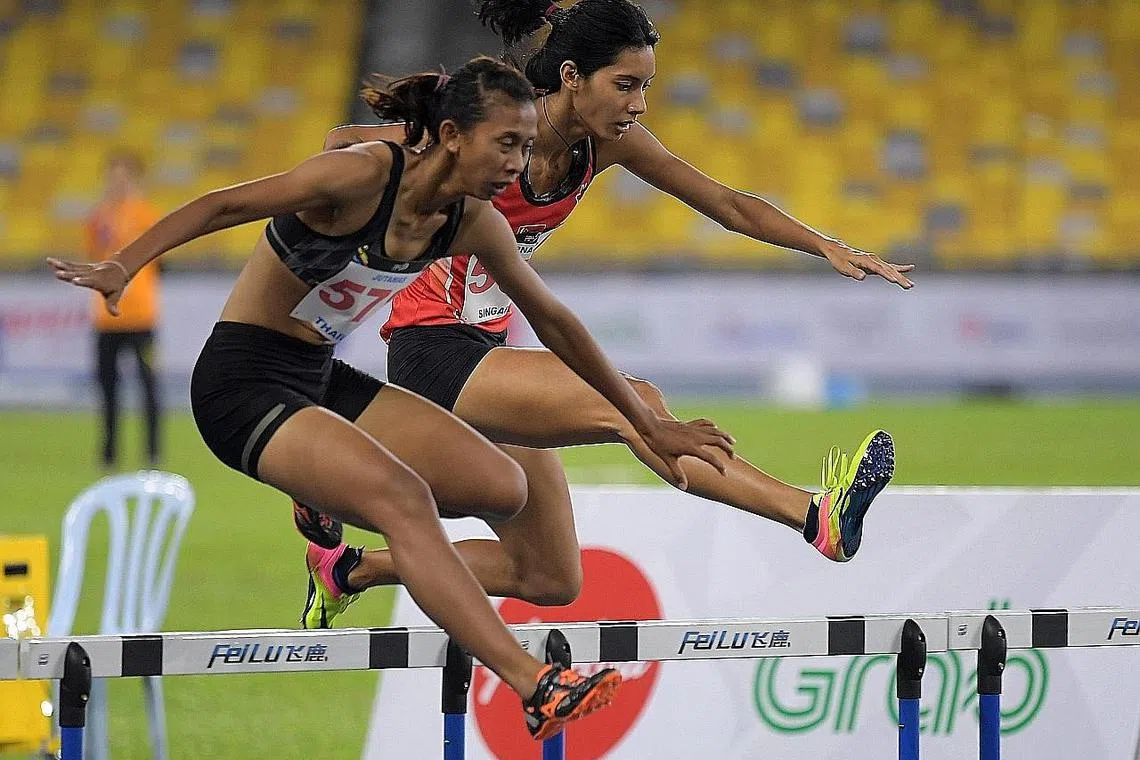 MEMBERANGSANGKAN: Dipna Lim-Prasad (kanan) bersaing hebat dengan peserta Thailand, Jutamas Khonkham, untuk memenangi pingat perak perlumbaan 400 meter berpagar. - Foto THE STRAITS TIMES -