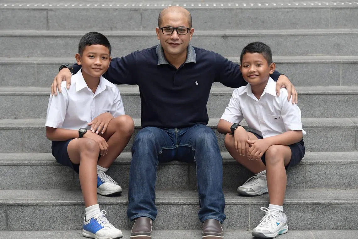 BERCITA-CITA BESAR: Muhammad Raihan (kiri) dan Muhammad Razin (kanan), bergambar dengan bapa mereka, Encik Mohd Airudin. - Foto THE STRAITS TIMES -