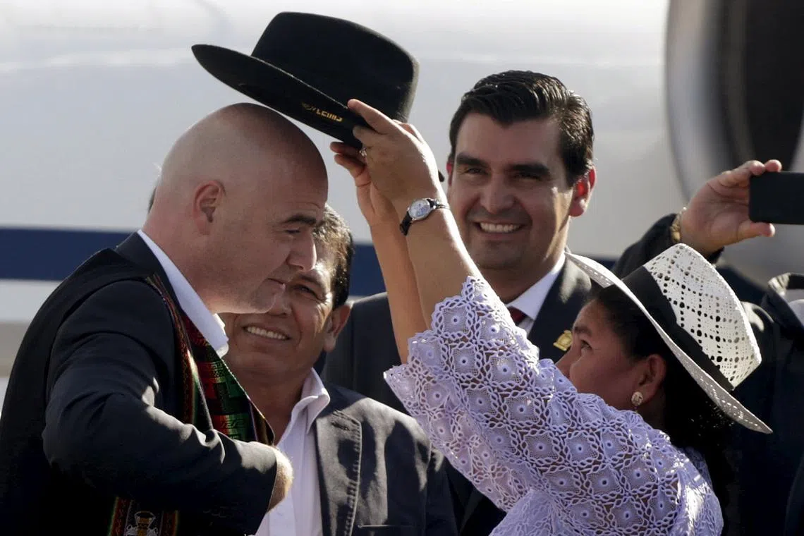 DIBERI SAMBUTAN: Presiden Fifa, Gianni Infantino (kiri), menerima topi daripada seorang ketua suku kaum, Leonilda Zurita, setibanya di Cochabamba, Bolivia. - Foto REUTERS -