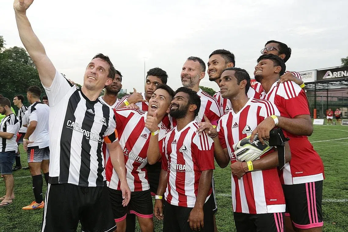 TEMUI PEMINAT SINGAPURA: Bekas kapten Manchester United Gary Neville (memegang telefon bimbit) memetik 'wefie' dengan pemain Piala Arena bersama dengan seorang lagi legenda United, Ryan Giggs (barisan belakang, tiga dari kanan). - Foto THE ARENA -