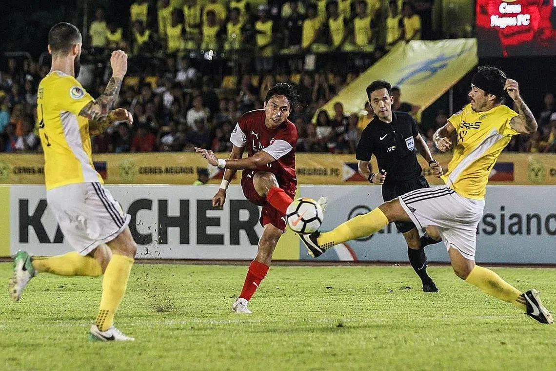 TIDAK MUDAH MENYERAH: Shahril Ishak (jersi merah) dan rakan sepasukannya akan mencuba untuk mendapatkan kemenangan dalam perlawanan kedua menentang Ceres di padang sendiri Rabu nanti. - Foto HOME UNITED -