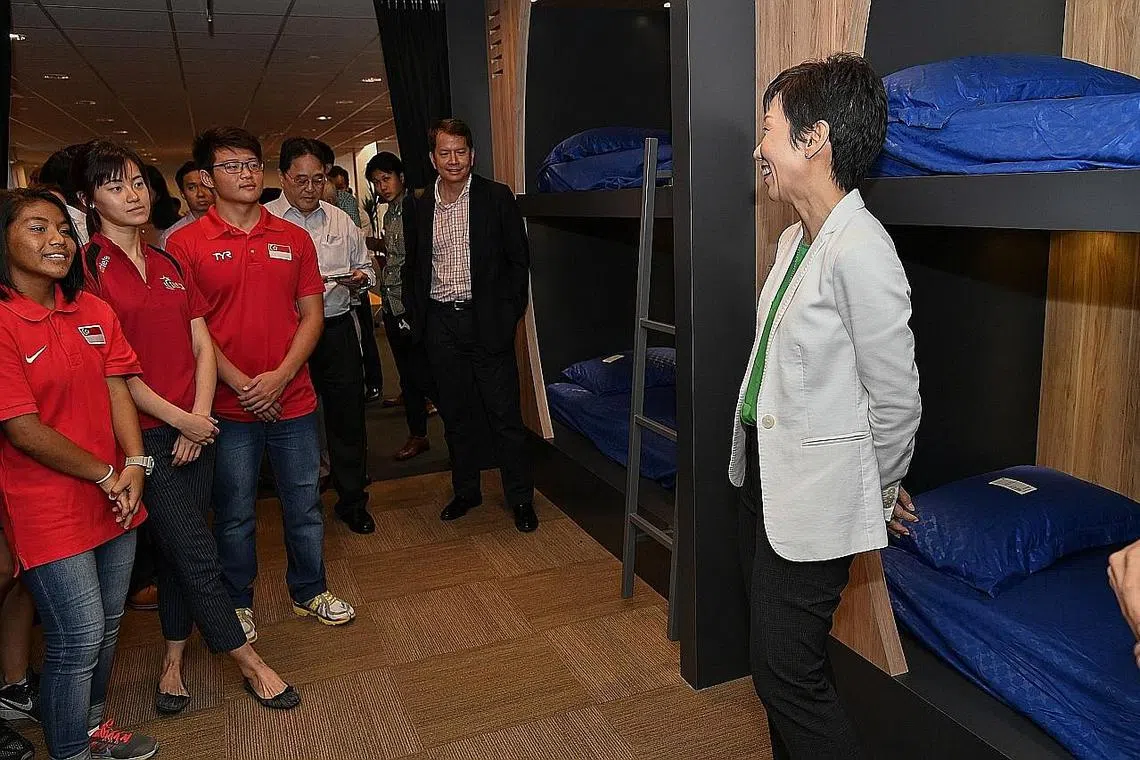 ASAH BAKAT ATLIT REMAJA: Cik Grace Fu (kanan) berinteraksi dengan atlit remaja yang kini dapat manfaat kemudahan di ruang baru, NYSI Satellite@Kallang, untuk membangunkan bakat mereka. - Foto THE STRAITS TIMES -