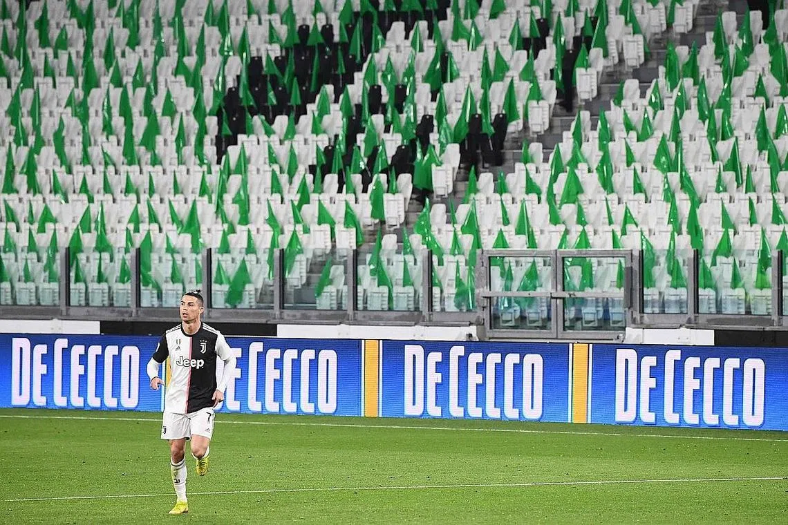 'SYIOK SENDIRI': Penyerang pasukan Juventus asal Portugal, Cristiano Ronaldo, berlari untuk cuba mendapatkan bola semasa perlawanan Liga Serie A menentang Inter Milan di stadium Juventus yang kosong di Turin, pada 8 Mac lalu setelah larangan dikuatkuasa bagi mengekang penularan koronavirus. - Foto AFP -