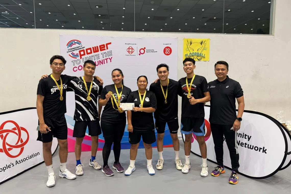 Siti Aisyah Umairah Mohamad Mokhtar (tiga dari kiri) dan Muhammad Adib Rosdi (dua dari kanan) meraikan kemenangan dalam kejohanan bola lantai Kejohanan Komuniti GRC Sembawang. Persahabatan mereka yang terjalin erat turut menjadi kekuatan utama sepanjang kejohanan. - Foto PA