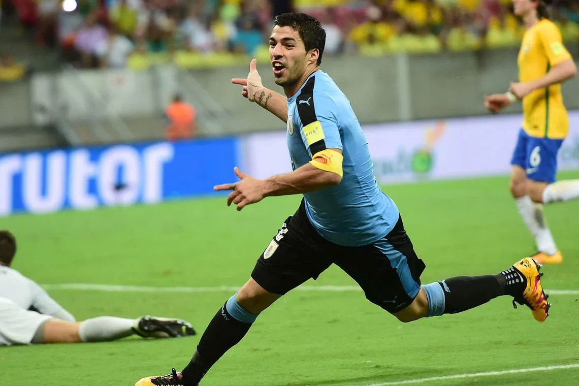 GOL: Luis Suarez meraikan jaringannya ke atas Brazil dalam perlawanan kelayakan Piala Dunia Zon Amerika Selatan minggu lalu. - Foto AFP -