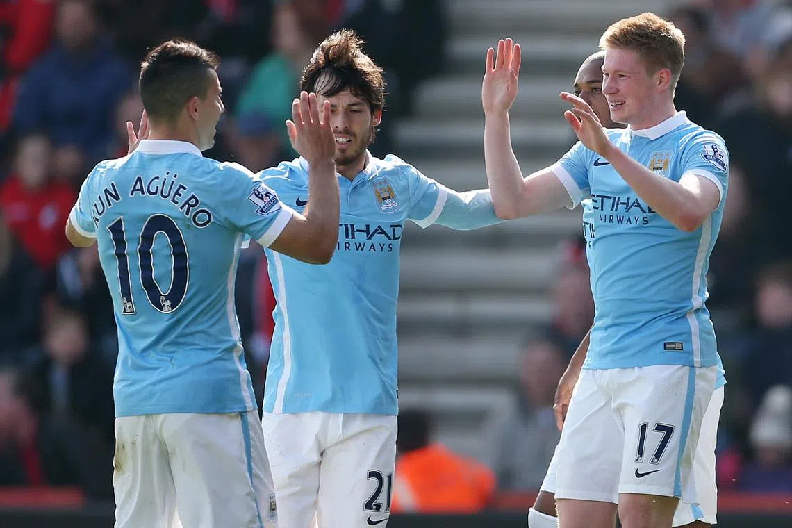 CABARAN GETIR: Barisan pemain City, (dari kiri) Sergio Aguero, David Silva dan Kevin De Bruyn, meraikan kemenangan ke atas Bournemouth hujung minggu lalu. Cabaran lebih sengit menanti City apabila bertandang ke padang PSG dalam pertemuan pertama suku akhir Liga Juara-Juara hari ini. - Foto REUTERS -