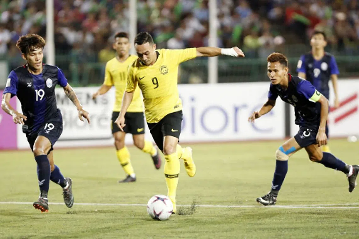 WIRA MALAYSIA: Norshahrul Idlan Talaha (tengah) berjaya menjaringkan gol bagi Malaysia mengalahkan Kemboja 1-0. - Foto EPA-EFE -