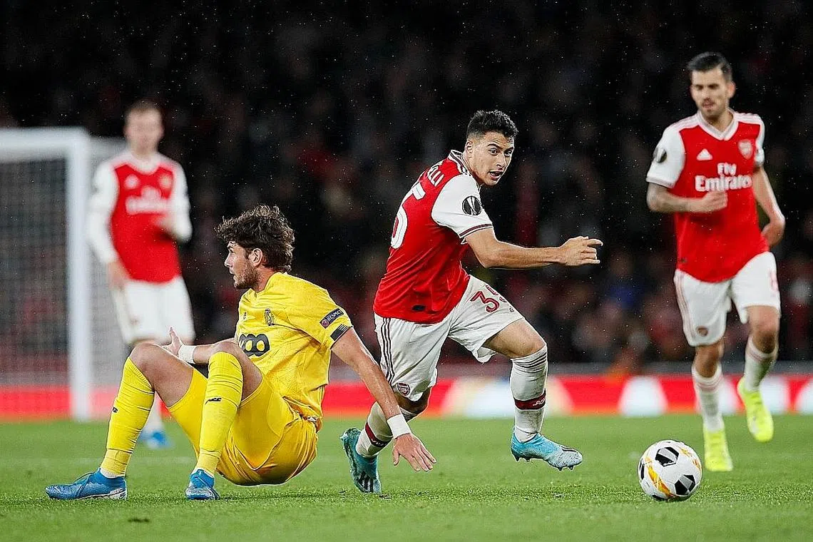 BAKAT MUDA: Martinelli (tengah) berjaya memperdayakan pemain Standard, Felipe Avenatti dalam perlawanan yang menyaksikan beliau menjaringkan dua gol untuk Arsenal dalam kemenangan 4-0. - Foto REUTERS -