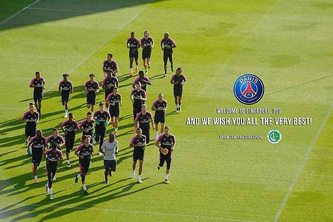 REBUT PELUANG: Badan pertubuhan Melayu/Islam, Jamiyah, yang bangunannya terletak berhampiran padang bola sepak di Lorong 12 Geylang, tidak ketinggalan untuk sama-sama mengucapkan selamat datang dan mengucapkan maju jaya kepada kelab bola sepak Perancis, Paris Saint-Germain (PSG), yang berlatih di situ bagi kejohanan Piala Juara-Juara Antarabangsa (ICC) 2018 yang berlangsung Sabtu ini. - Foto FACEBOOK/JAMIYAH SINGAPURA -