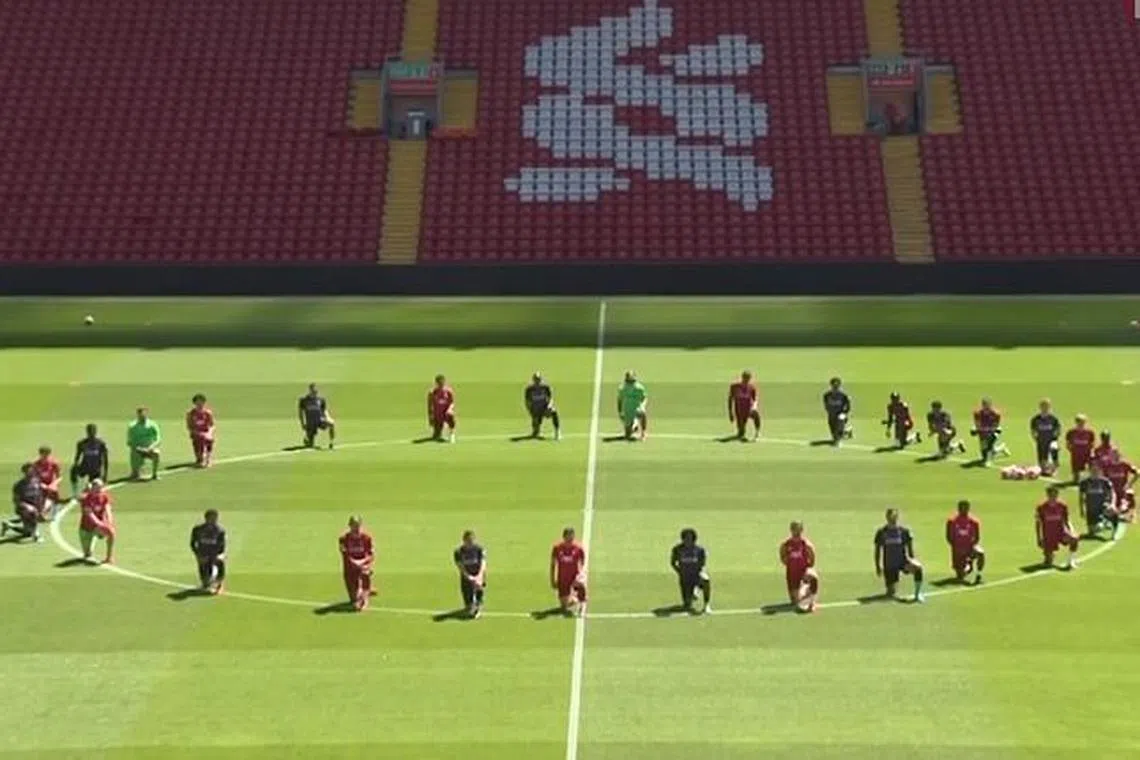 LONDON: Seramai 29 pemain kelab bola sepak Liverpool berkumpul di bulatan tengah padang dan melulut sebagai menunjukkan sokongan terhadap pergerakan 'Black Lives Matter' susulan kematian Encik George Floyd di Amerika Syarikat pada 25 Mei lalu.