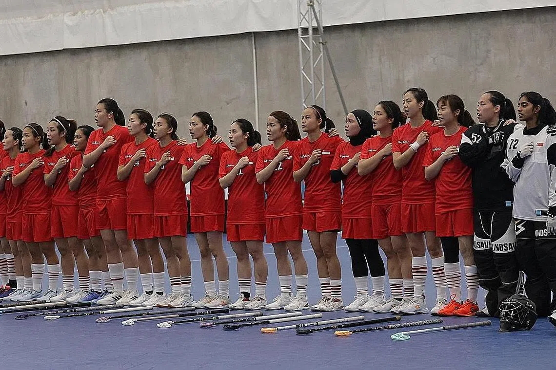 PASUKAN floorball wanita Singapura memulakan pertahanan pingat emas mereka di Sukan SEA dengan pesta gol 16-0 ke atas tuan rumah Kemboja di Dewan Taman Dinosaur pada Khamis.
