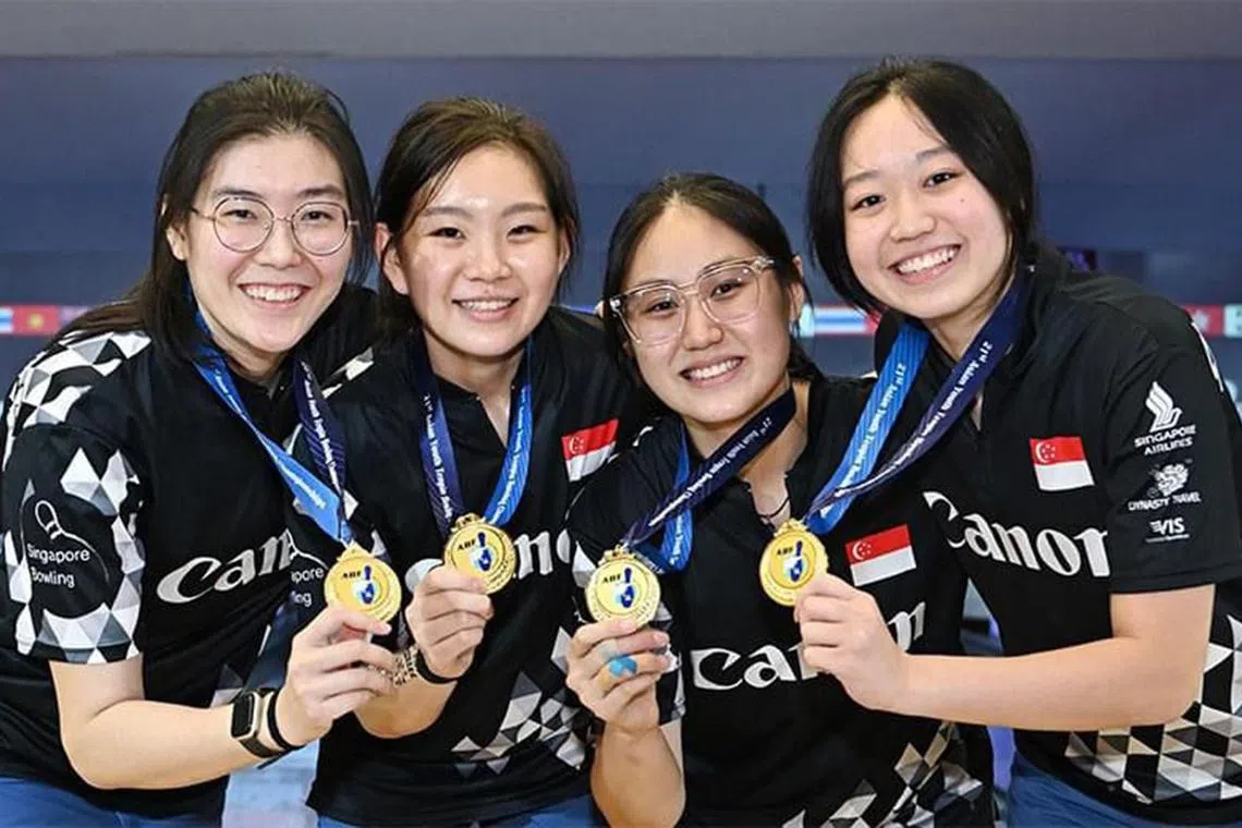 Pasukan boling Singapura berjaya merangkul pingat emas dalam acara pasukan perempuan pada Kejohanan Boling Tenpin Belia Asia 2023 di Bangkok.