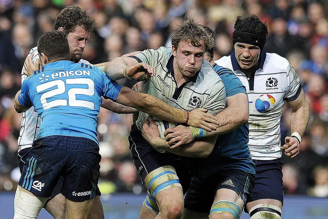 BAKAL BERDEPAN LAGI: Pemain Scotland (berjersi putih) berdepan dengan pasukan Italy dalam satu perlawanan di Edinburgh, Scotland, pada 18 Mac lalu. - Foto AFP -