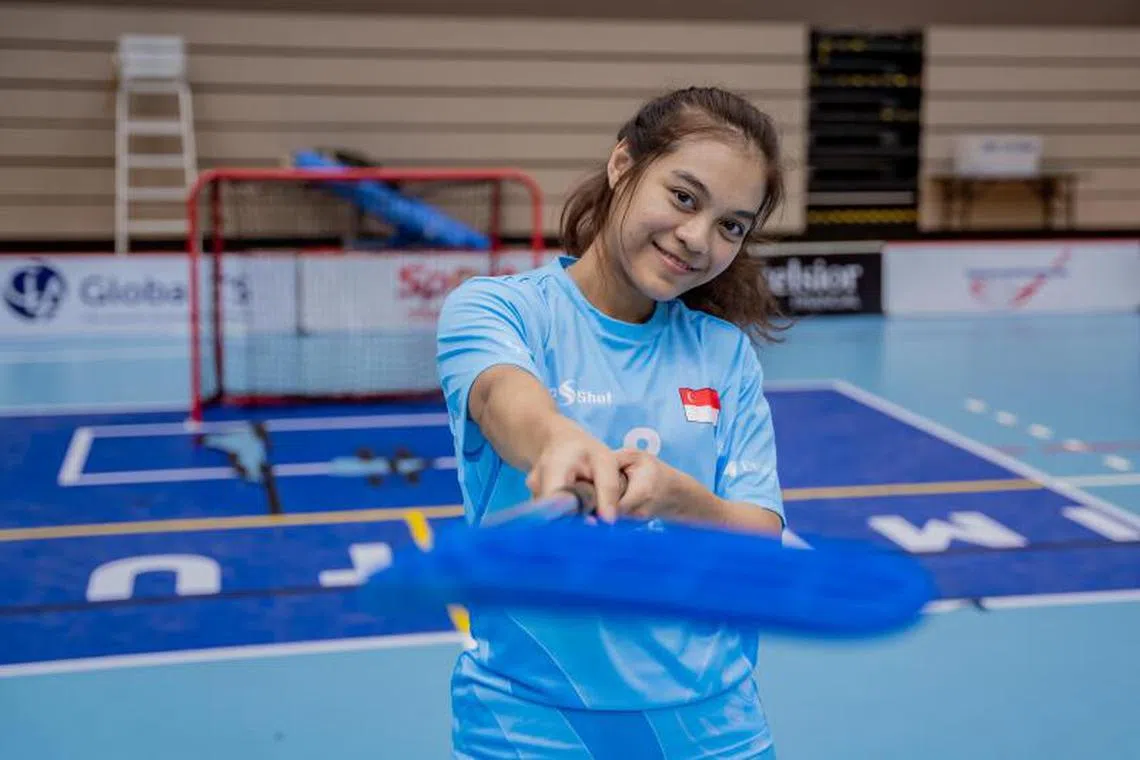 GHAIRAH BERAKSI: Pemain floorball wanita Singapura, Siti Nurhaliza Khairul Anuar, dilantik sebagai salah seorang daripada 16 duta dalam projek GoGirls! untuk Kejohanan Floorball Dunia Wanita 2023. - Foto BH oleh NUR DIYANA TAHA