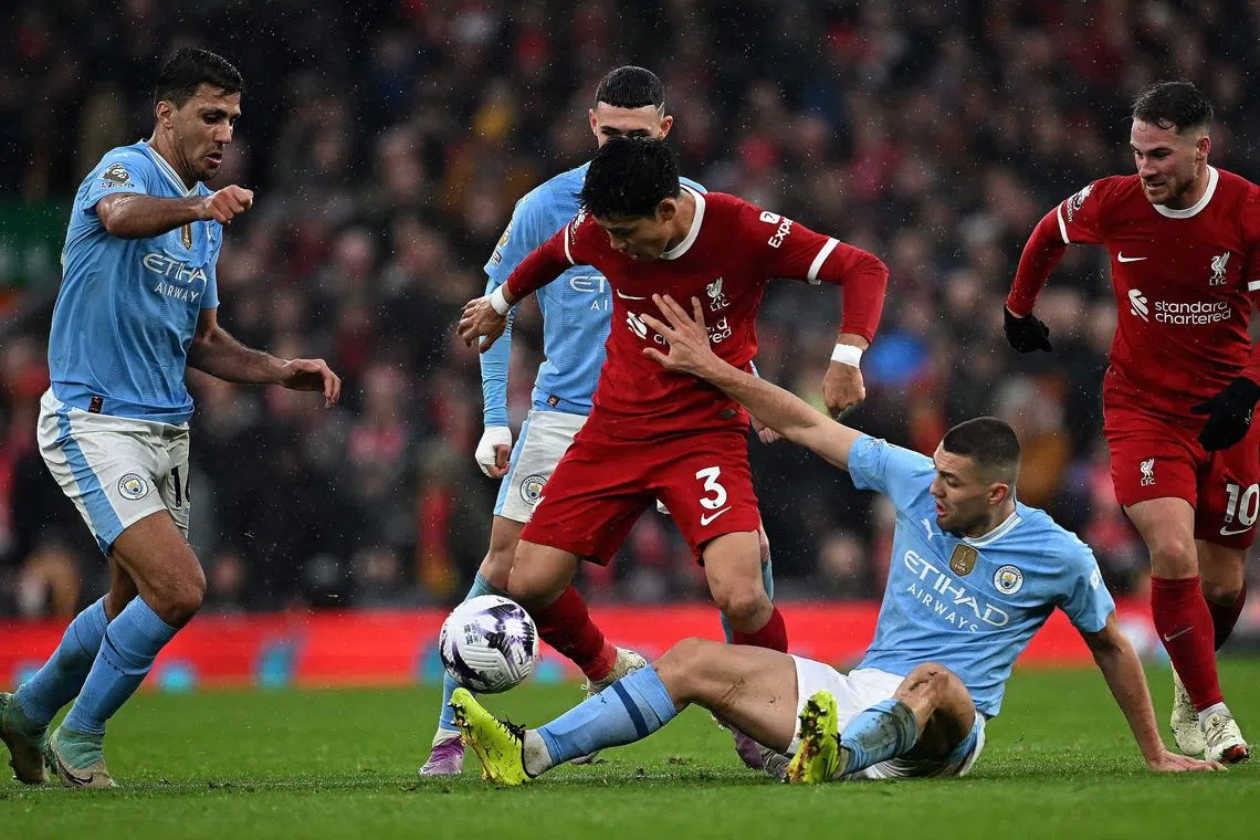Pemain tengah Manchester City, Mateo Kovacic (dua dari kanan), dan pemain tengah Liverpool, Wataru Endo (tengah), berebut semasa perlawanan yang sengit antara dua pasukan itu di Anfield pada 10 Mac. - Foto AFP