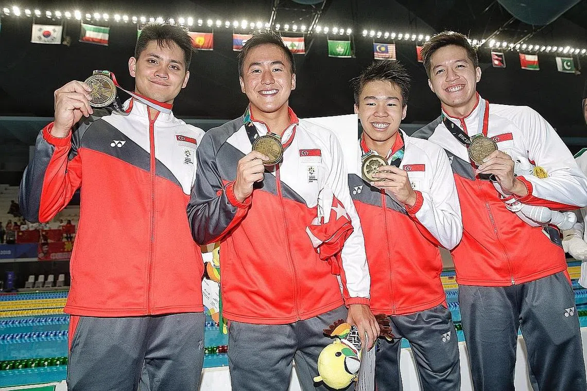 PINGAT PERTAMA SINGAPURA: (Dari kiri) Joseph Schooling, Quah Zheng Wen, Jonathan Tan dan Danny Yeo memastikan Singapura meraih pingat gangsa dalam perlumbaan 4x200m relay gaya bebas, yang pertama buat Singapura dalam temasya Sukan Asia Indonesia ini. - Foto BH oleh KEVIN LIM -