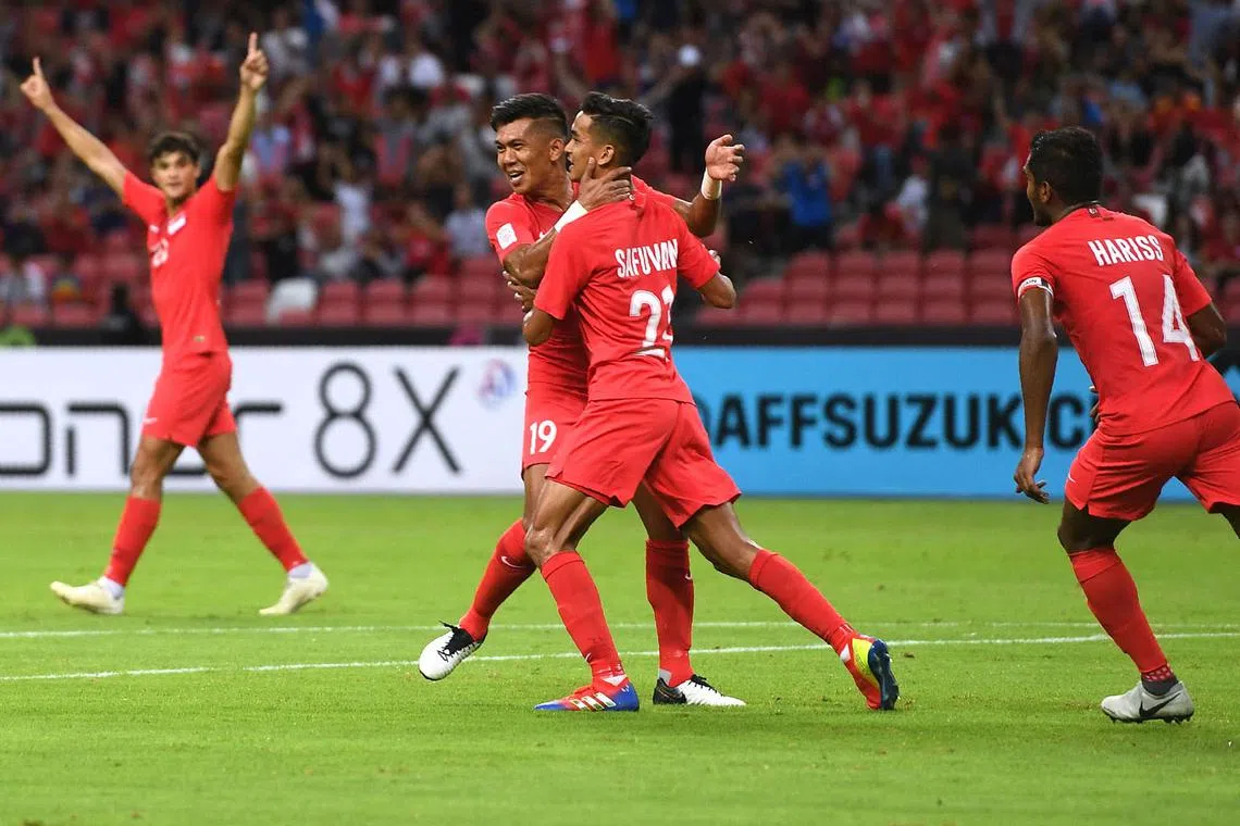SUMBAT TIGA GOL: Safuwan (tengah, jersi nombor 21) tenang meraikan salah satu daripada tiga golnya. - Foto AFP -