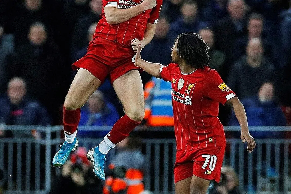 GOL SULUNG: Curtis Jones (kiri) meraikan gol senior pertamanya untuk Liverpool bersama rakan sepasukan Yasser Larouci. - Foto REUTERS -
