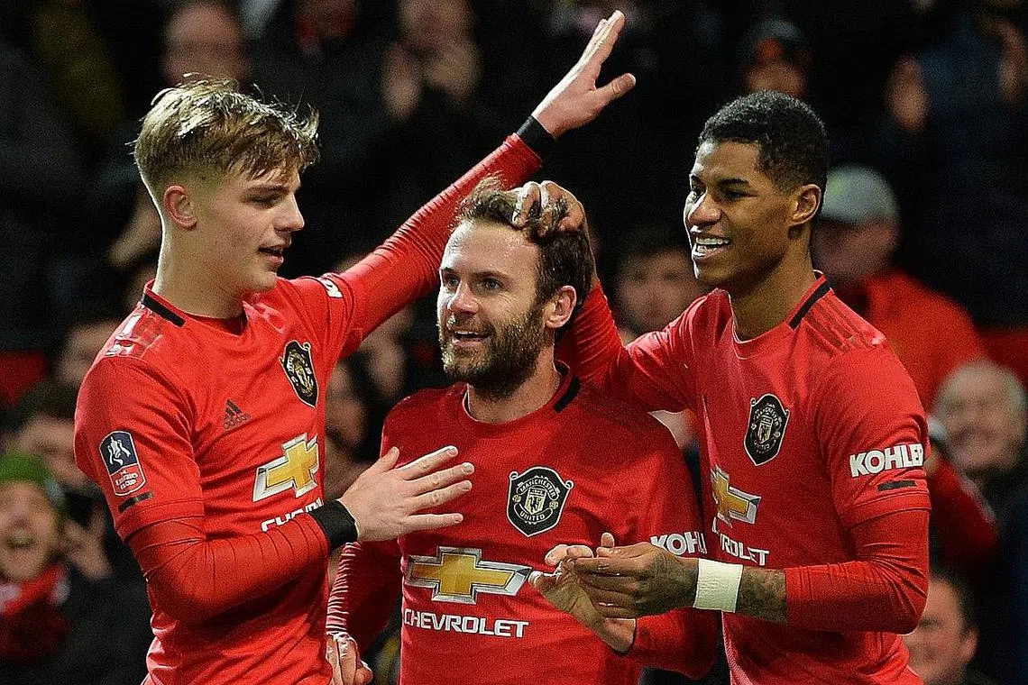 MATA KEMENANGAN: Pemain tengah Manchester United asal Sepanyol, Juan Mata, menjaringkan gol tunggal pada minit ke-67 yang membawa kemenangan 1-0 ke atas Wolverhampton Wanderers. Bersamanya ialah Brandon Williams (kiri) dan Marcus Rashford (kanan) semasa perlawanan ulangan pusingan ke-3 Piala FA England di Manchester, awal pagi semalam. - Foto EPA-EFE -